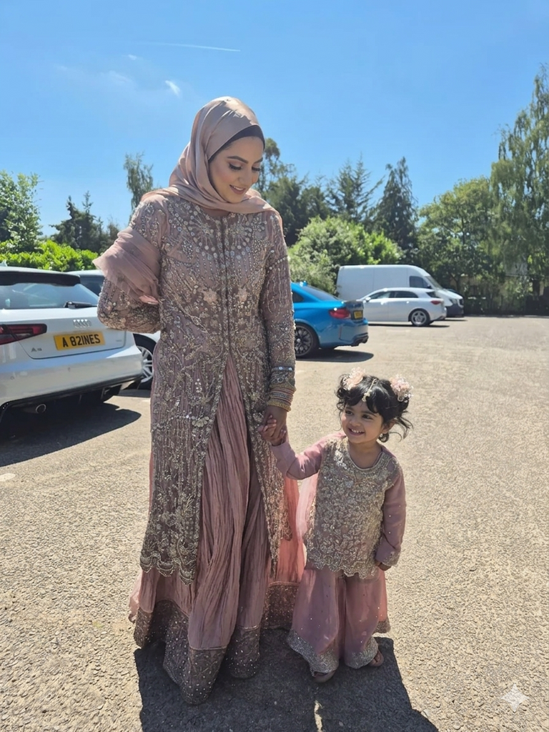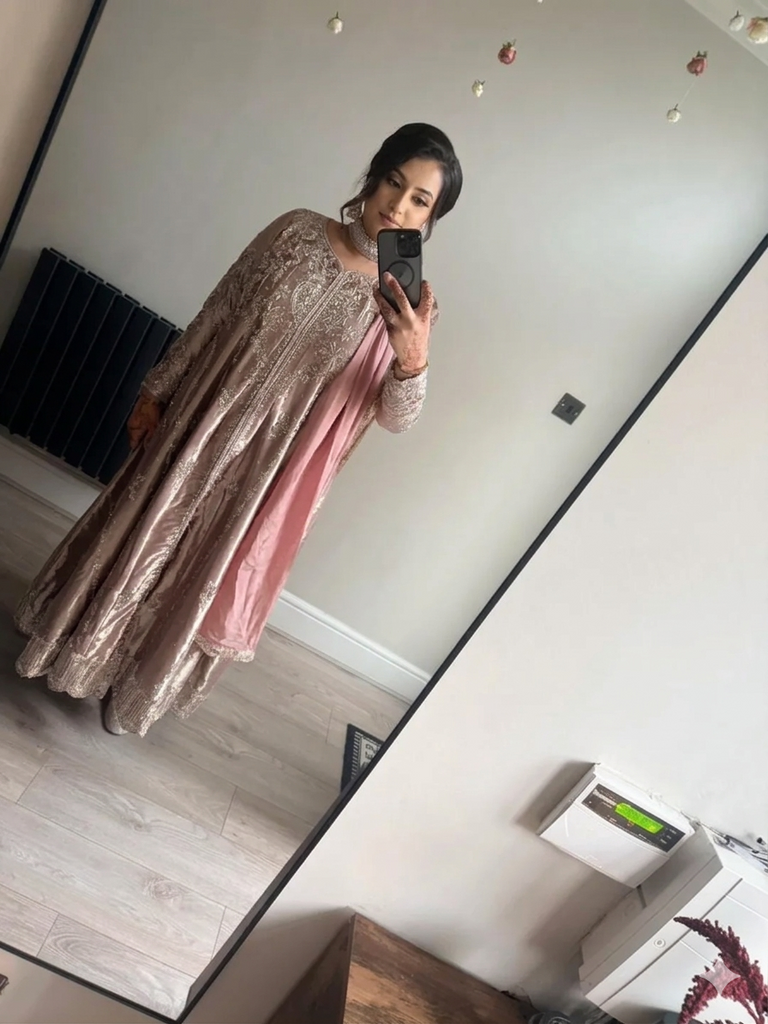 The Anamta bridal attire is an alluring blend of modern luxury and tradition. This exquisite outfit, which features a mint green lehenga with delicate fuchsia pink tints and elaborate gold...