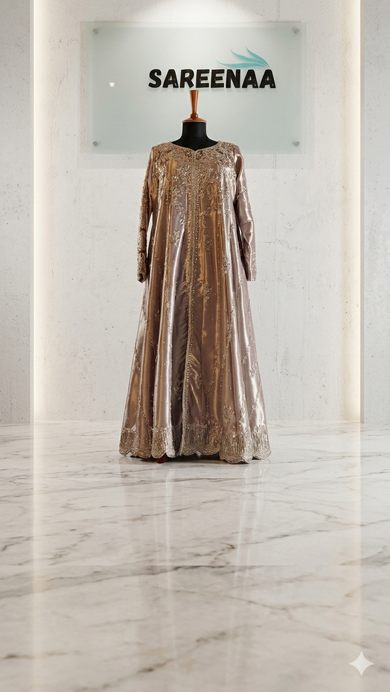 Erina emerges as a striking testament to contemporary artistry, where modernity meets impeccable craftsmanship. The deep teal silhouette drapes with fluidity and grace, its texture enriched by meticulous hand detailing...