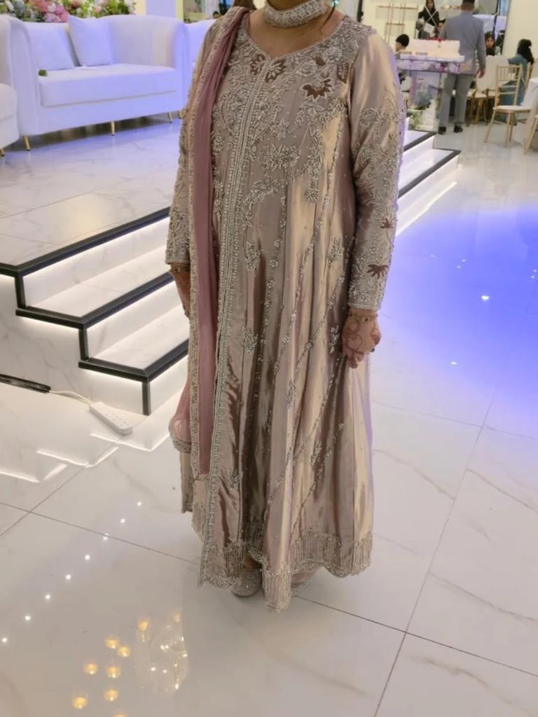 Anahita is a graceful white silhouette with lustrous floral embellishment of dazzling sparkles and pearls. Crafted on premium net fabric along with raw silk flayed embroidered pants, this beauty is...